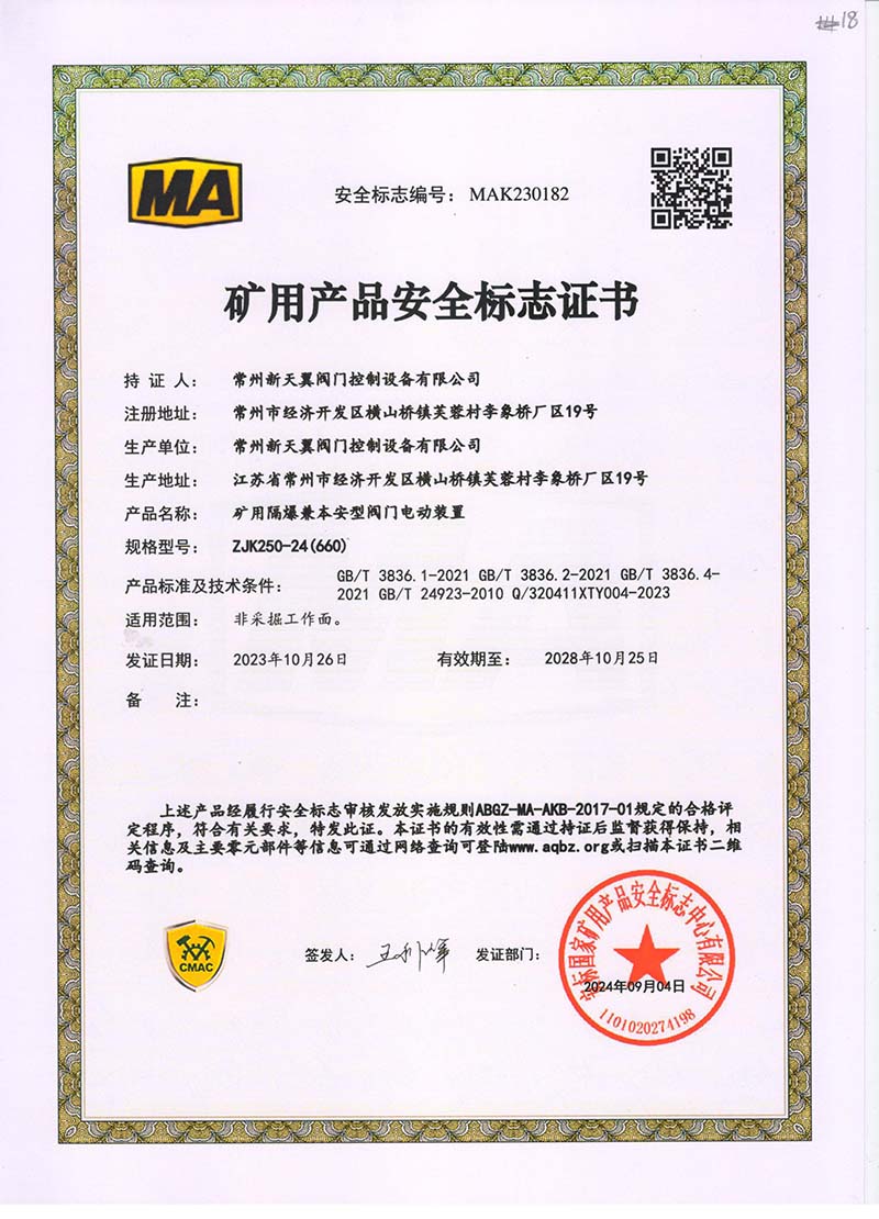 礦用隔爆ZB10-24中國國家強制性產品認證證書110.2